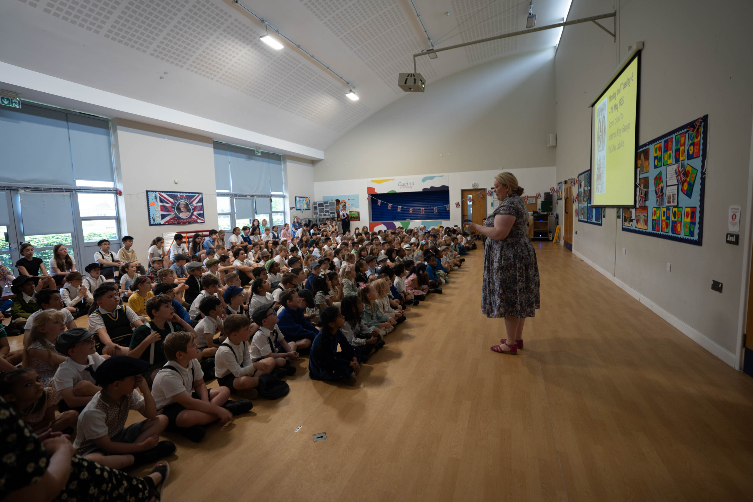 A large group of children, many in historical dress, are seated on the floor in what looks like a school hall, listening to an adult woman who is standing and presenting. This could be a historical talk or assembly related to the school's history.