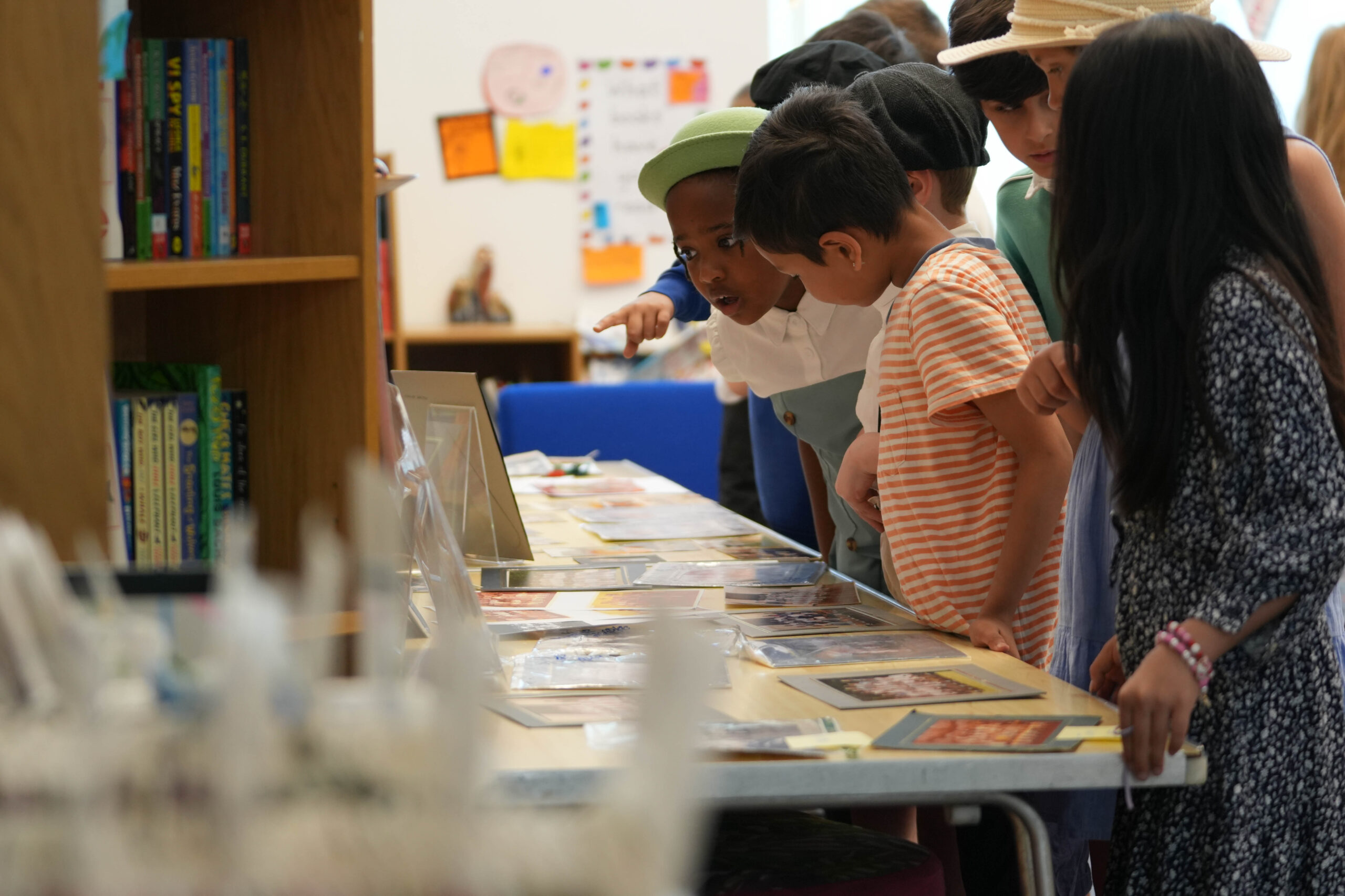 Children are looking at historical documents or photographs displayed on a table. This is likely an exhibition or display designed to educate them about the school's history.